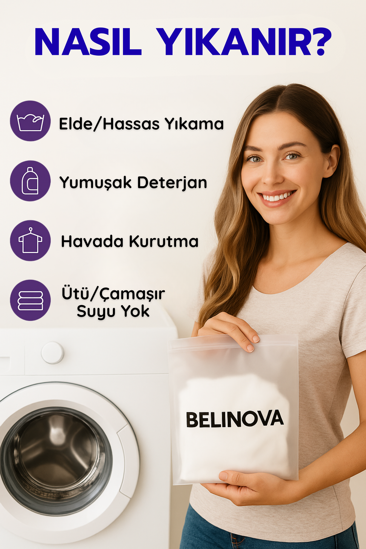 En ideal yöntem elde veya hassas programda, yumuşak deterjanla yıkamaktır. Yıkadıktan sonra kurutma makinesi kullanmadan, sadece havada kurutun. Ütü, çamaşır suyu ve yüksek ısı ürünün dokusuna zarar verebileceğinden kullanılmamalıdır.