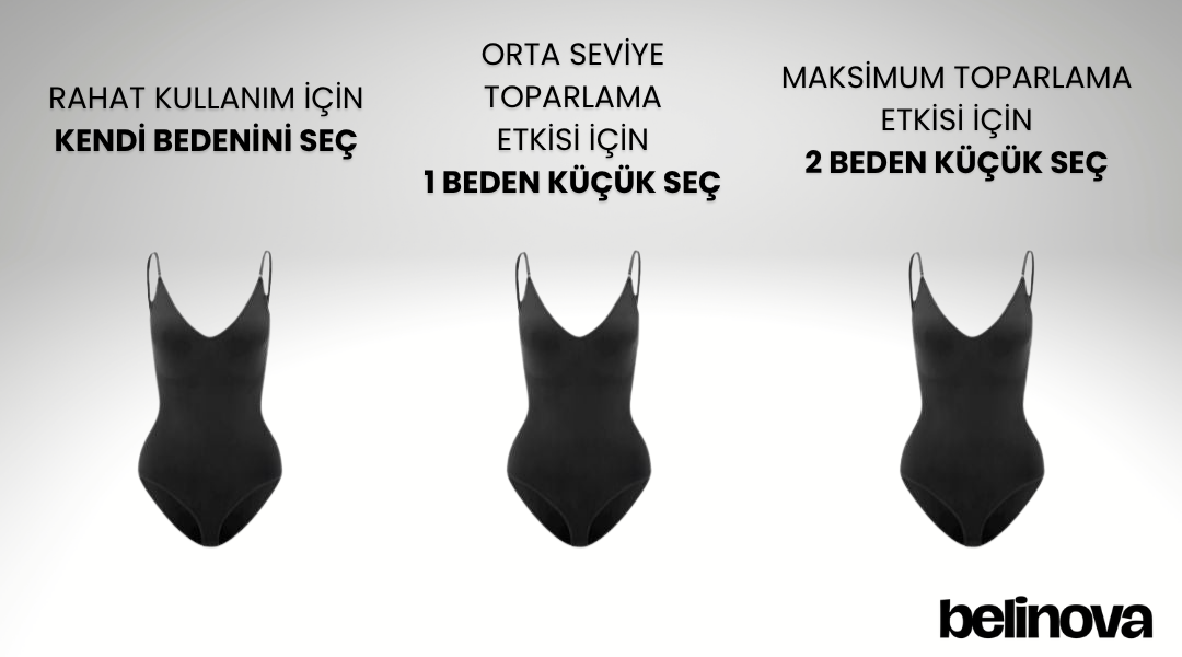 En güçlü inceltme etkisi için → 2 beden küçük tercih edilebilir.